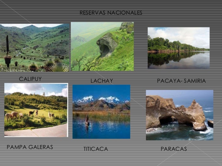 *Reservas Nacionales: Las Reservas Nacionales forman parte de las áreas naturales protegidas del país. También son zonas designadas a la conservación de la diversidad biológica, los recursos de la flora y fauna silvestre y su utilización sostenible. Son: Pampas Galeras - Ayacucho, Reserva de Junín, Reserva de Paracas - Ica, Reserva Lomas de Lachay - Lima, Reserva Titicaca - Puno, Reserva Salinas y Aguada Blanca - Arequipa, Reserva de Calipuy - La Libertad y Reserva Pacaya Samiria - Loreto y Ucayali.